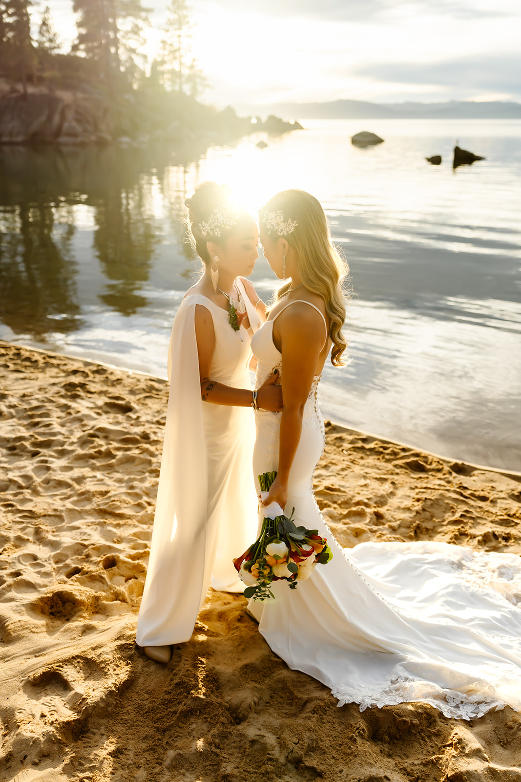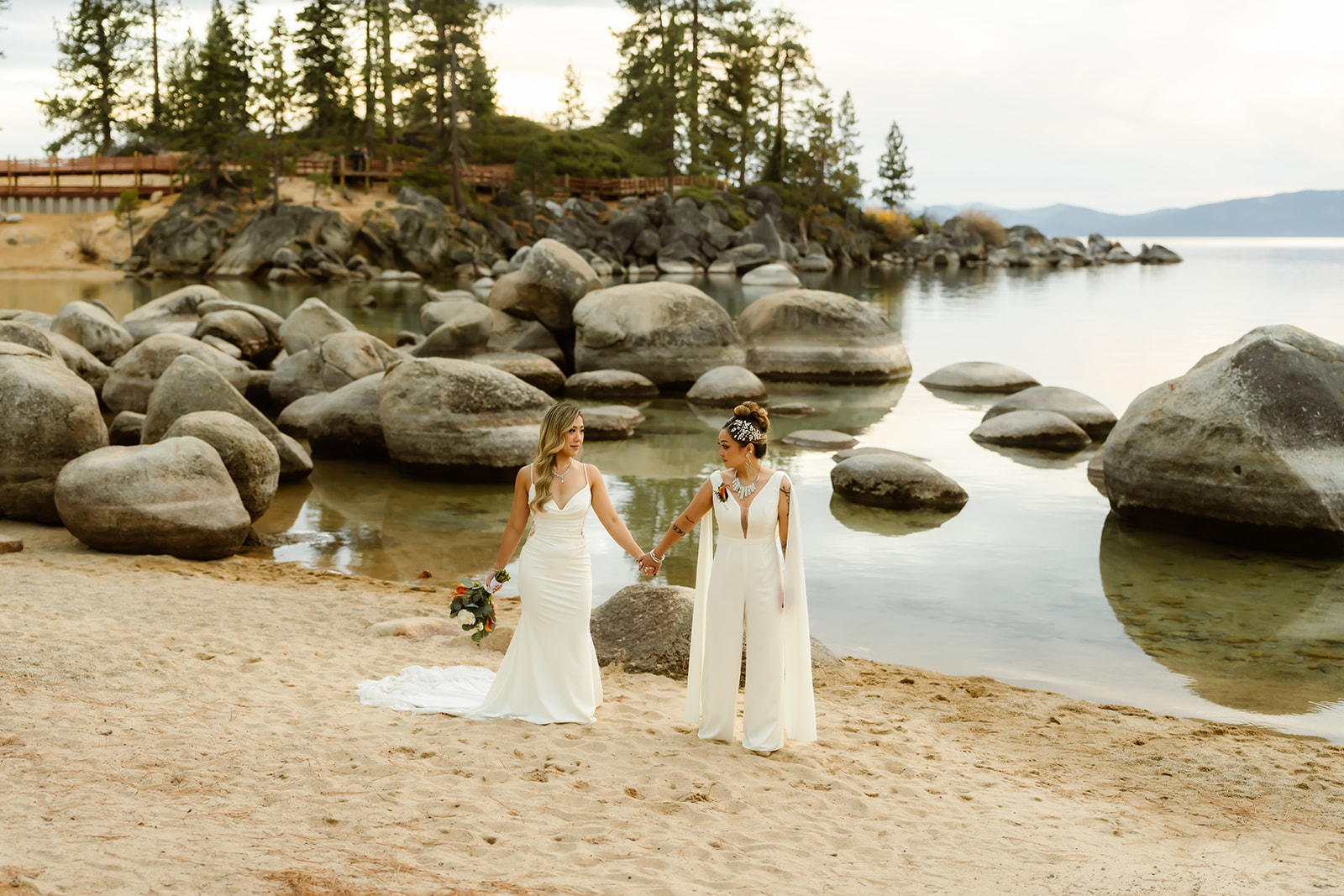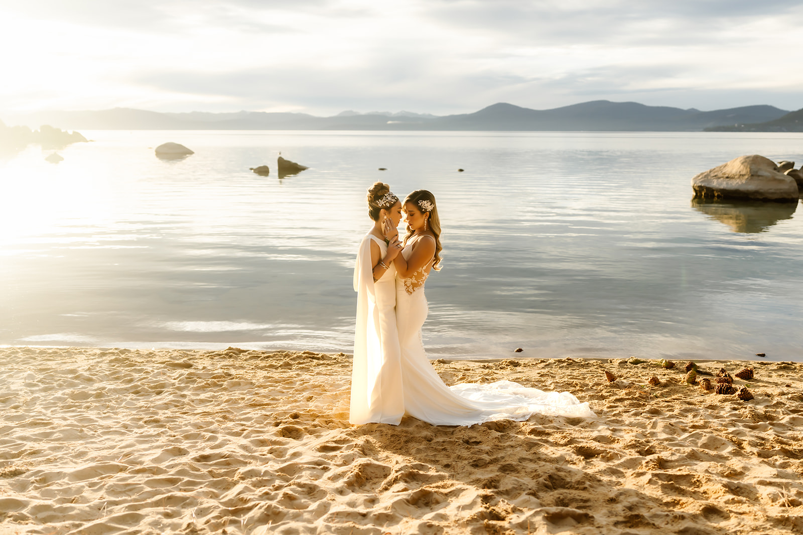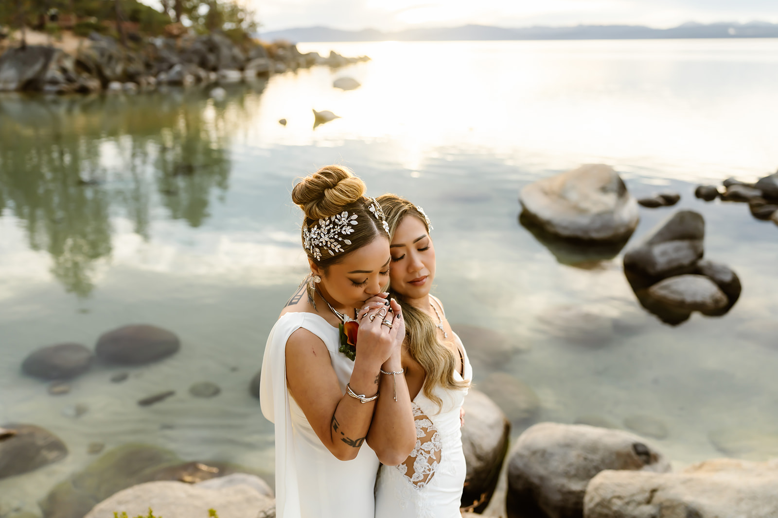 Christine and Tracy’s Lake Tahoe elopement was simple and full of sweet moments. They started the afternoon getting ready at their resort in South Lake Tahoe, then we made our way to Emerald Bay for their ceremony. The overlook was quiet, and it was the perfect place for them to exchange their private vows. Afterward, we headed to Sand Harbor to catch the sunset and wrap up the day with more photos on the beach.