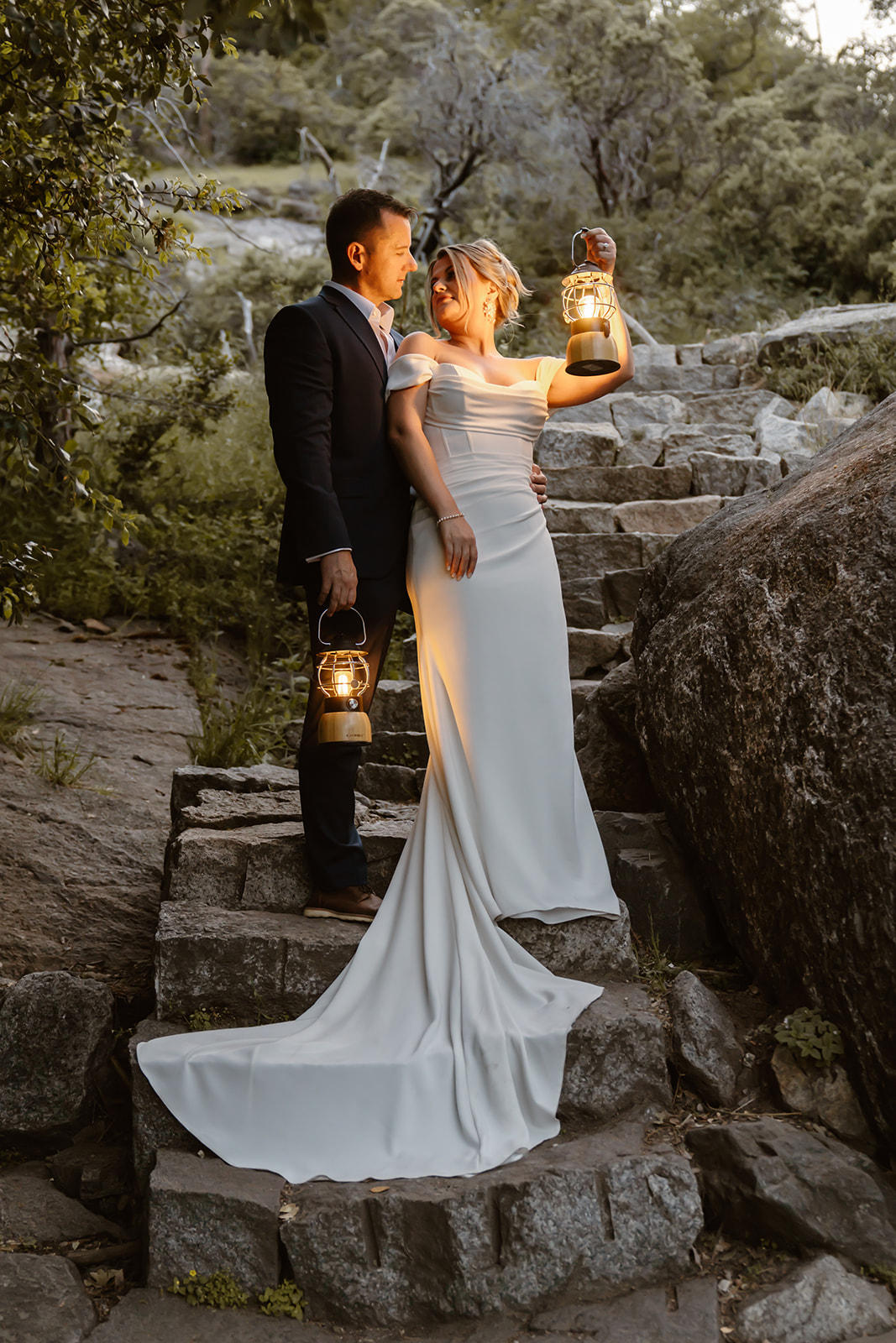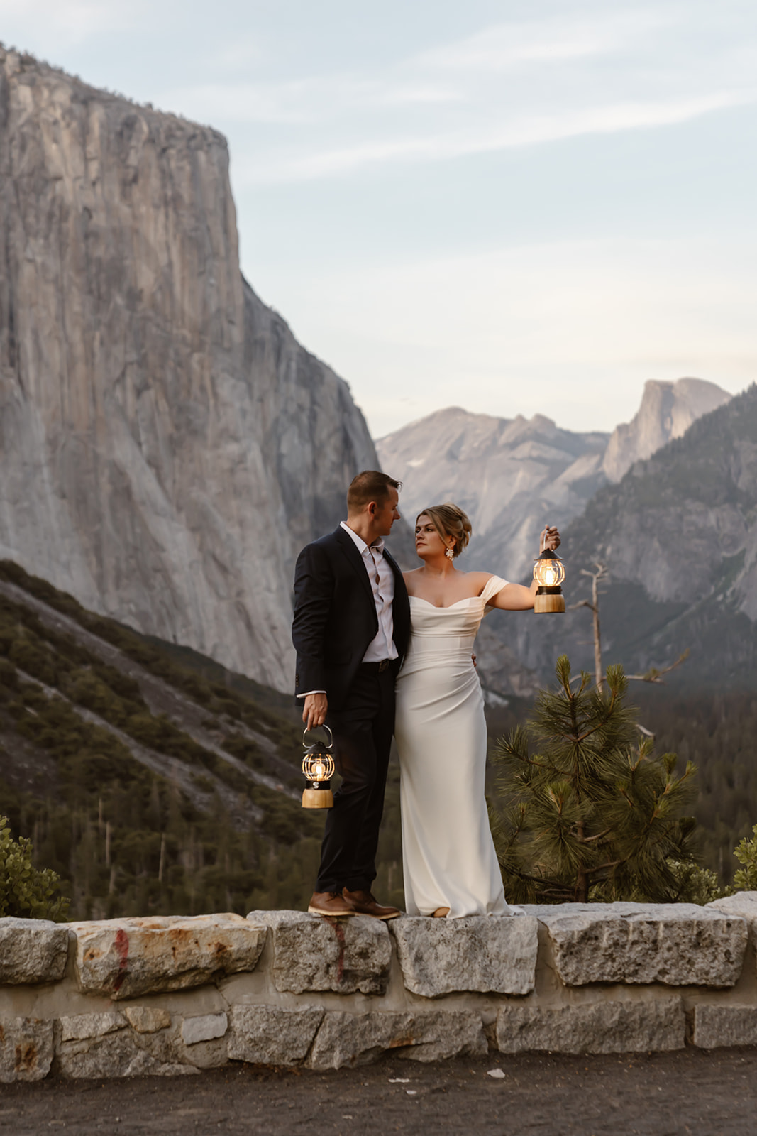 We stayed at Tunnel View as the light softened and the sky began to change. Sunset brought a quieter, more romantic feel to the overlook. To end the evening, we brought out lanterns for photos as the light faded. It was a cozy way to close out their elopement day.